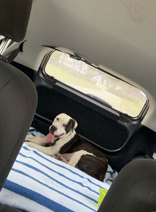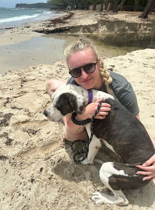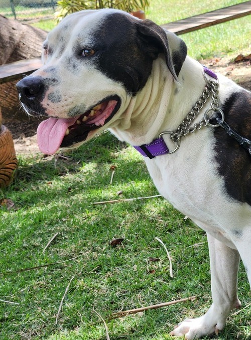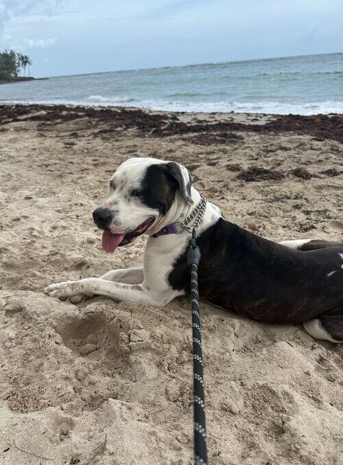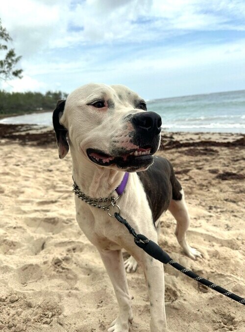 When Aaron arrived at Ocean Acres in 2024, he was skeletally thin, frightened, and barely able to stand. With time, care, and love, he has blossomed into a handsome 64‑pound young dog who radiates kindness.