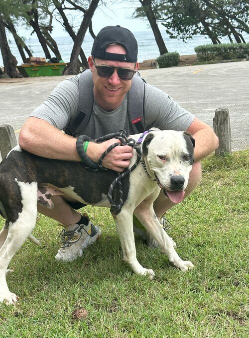 Aaron is gentle and affectionate with people, and his medium to low energy level makes him easy to live with. He is happy to relax or entertain himself with toys, and he especially loves toys and playing with coconuts. Over time he has become confident and sociable, and he enjoys meeting new people.