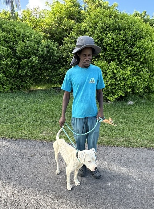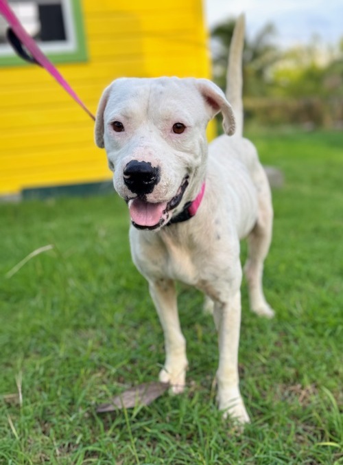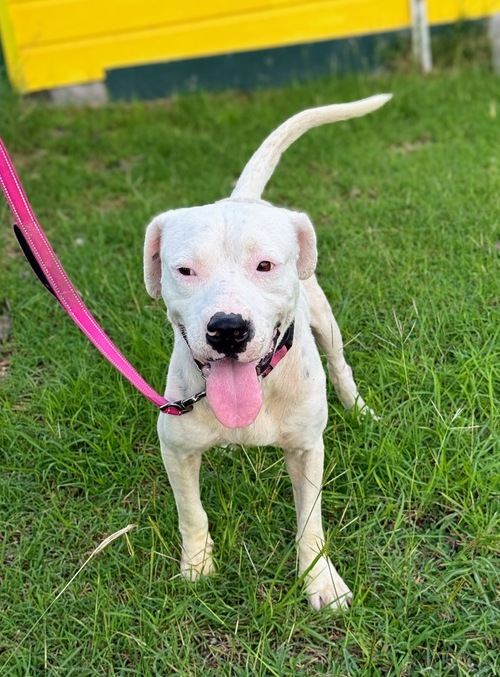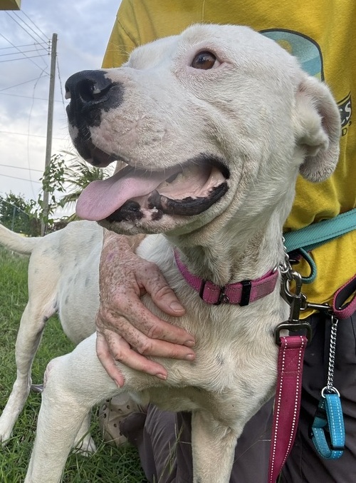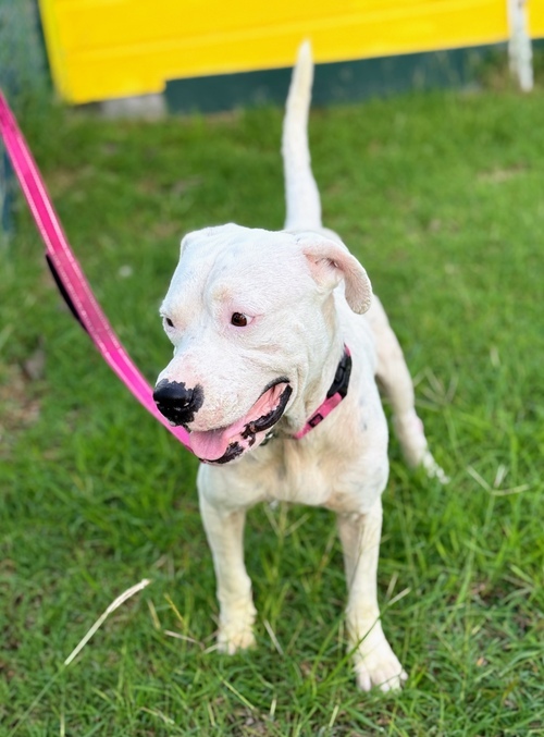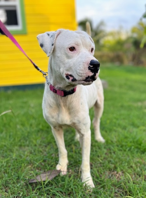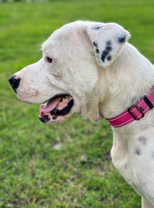 Arlo is strikingly beautiful, completely white except for a few black spots on his ears. His coloring means he cannot live outside in full sun, as white dogs are prone to skin cancer. His ideal home would be one where he lives indoors with his family, going outside at cooler times of the day and avoiding direct sun. Protective clothing and sunscreen can also help keep him safe.