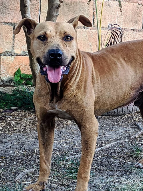 Bronze was one of those dogs who was bred to fight, wouldn’t fight and then dumped. He’s not too sure what to think of you at first but once he sees you’re ok, he’s quick to warm up to you. He came to us only knowing life tied on a short rope, so he walked in circles for the longest time (he actually walked in circles so much, he wore a large circle of grass out in his kennel!). He is slowly coming out of walking circles and has learned to walk on a leash. Because of his fighting history and visible anxiety, we have not tried him with other dogs. Our primary focus with Bronze has been working on his anxiety and giving him a better life, where the people around him love him. He has learned that when he hears the other dogs barking, he must also, just so they know he’s there. He is not an avid barker and does not bark just for the sake of hearing his own voice.