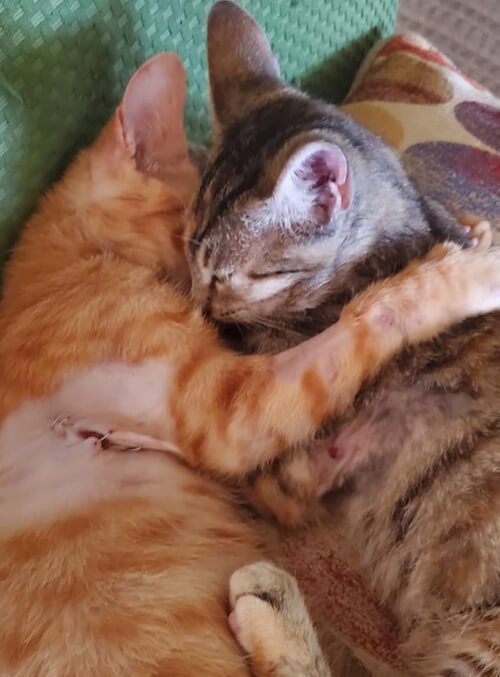 These two surgical rehab kittens are brother and sister. They had a scary start to life, their scars and stitches prove it. Butters, the ginger is a boy, Doodles, the grey tabby is a girl and they are from the same litter. Both are neutered.