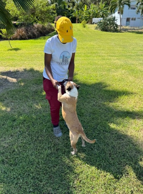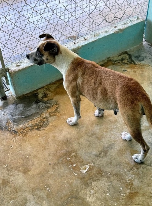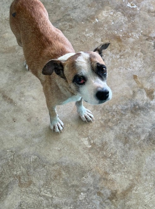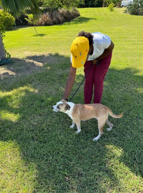Journee had been living rough for sometime. She’s had litters of puppies and who knows what became of them. She would always go up to people to try to befriend them, but people were scared and mean to her. Animal Control called us to go an pick her up as they had received complaints.