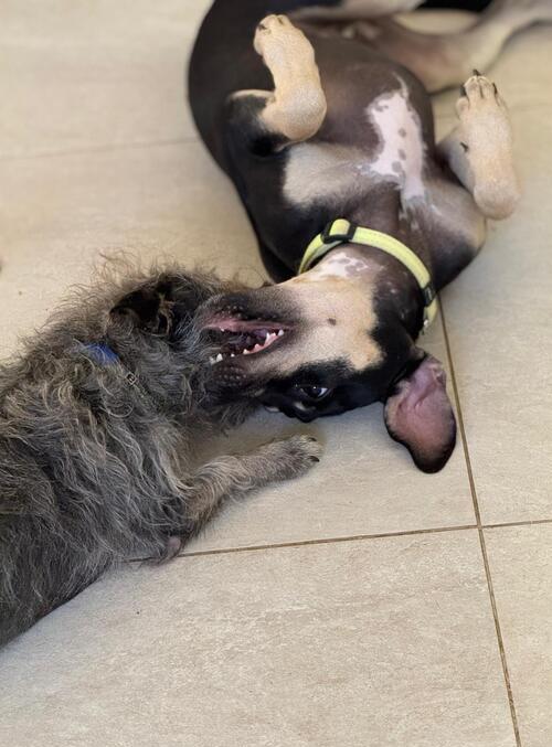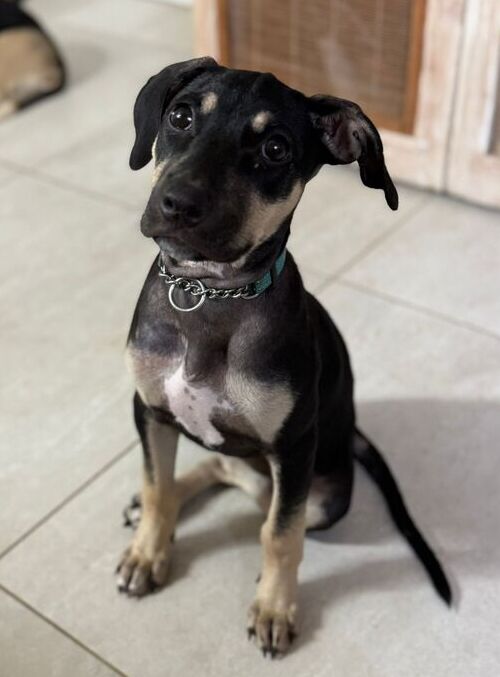 Kelly is an absolute sweetheart. She is well behaved in the house, comfortable spending time in her crate – and gets along with other dogs, cats, people, and children. Everyone who meets her falls in love. While she has lovely manners, she still has those joyful puppy moments—bouncing around, playing with toys, and happily engaging with other dogs who are willing to play. If they want to play hard she will too. She has learned to sit when told and would thrive with more training.