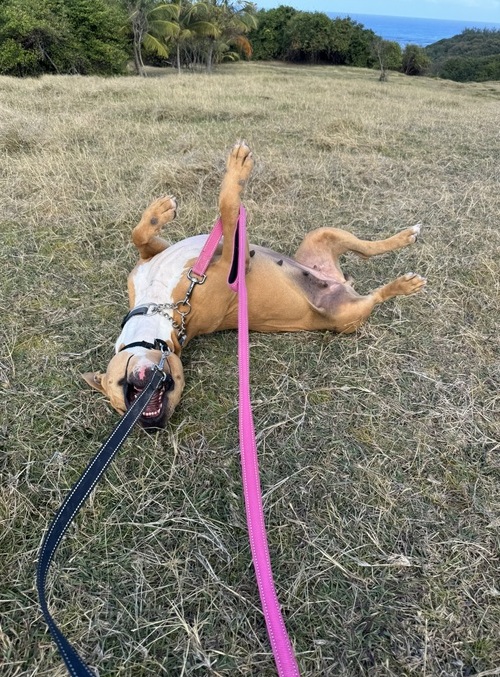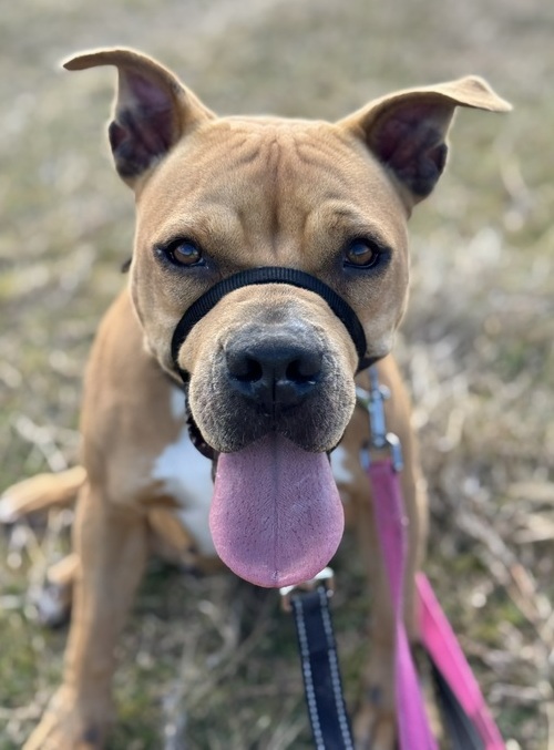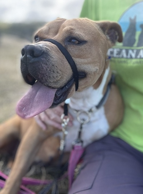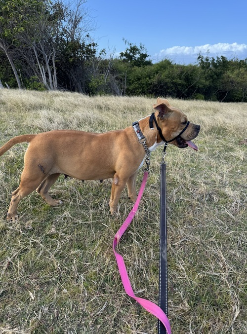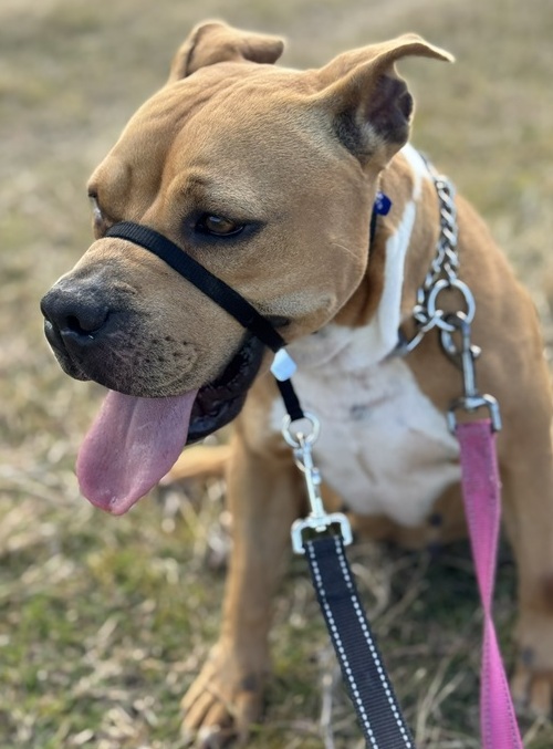 Nola has a lively, high‑energy personality and will thrive in a home where she can channel that energy into play, exercise, and adventure. Nola responds very well to training, and it would be wonderful for her to continue her lessons in her new home. She loves going on walks. She pulls in a normal flat collar, but with a gentle leader halter, she walks like a little lamb. She is happy to have the halter on and it makes walking with her an absolute delight.